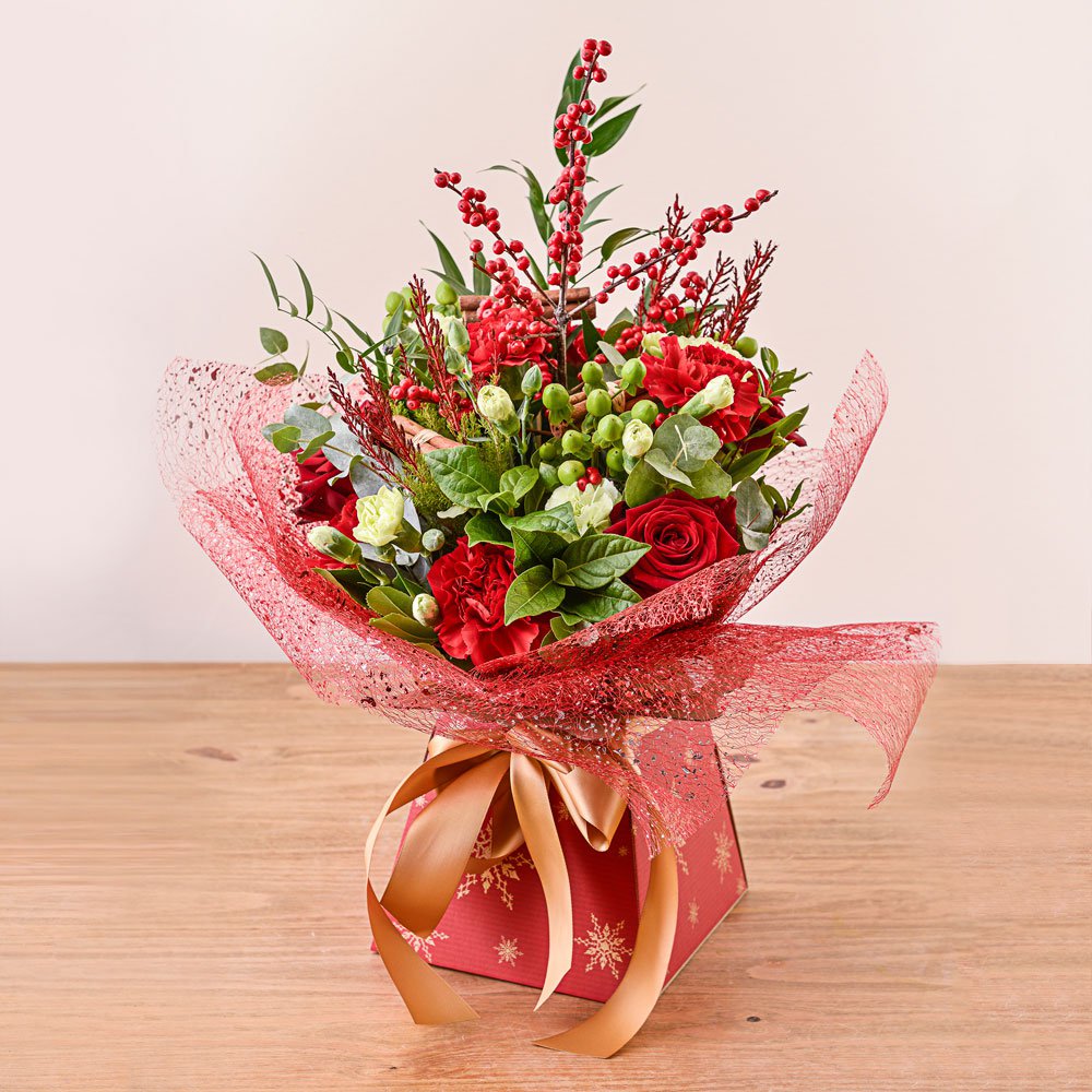 Lovely natural arrangement in lovely reds - perfect gift for an Anniversary.