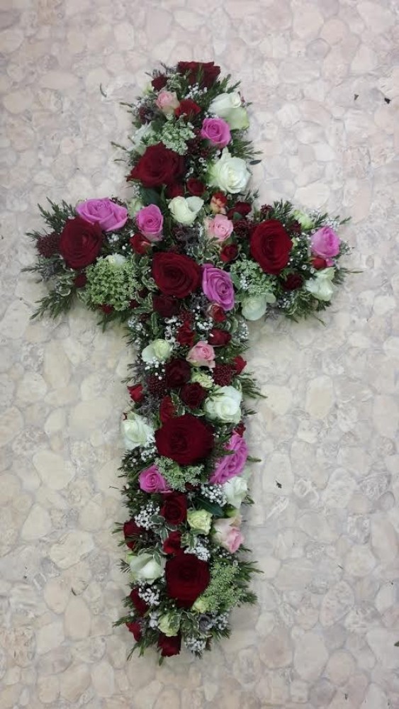 A beautiful cross made up of mixed roses with filler and Greenery.