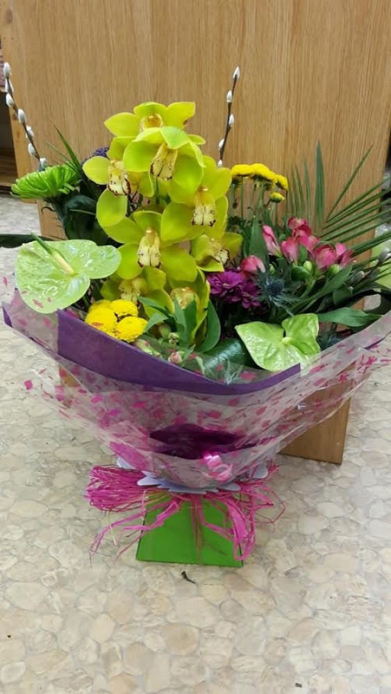 A beautiful modern arrangement in pinks yellows and greens. Arranged in Castle Box so there is no need for a vase.