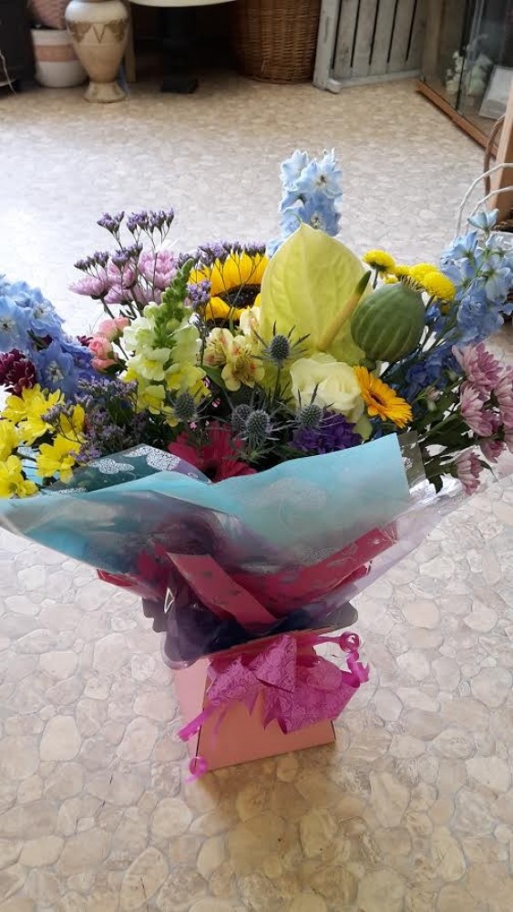 A beautiful castle box arrangement of fresh cut seasonal flowers. The hand tied is already arranged in water so there is no need for a vase!.