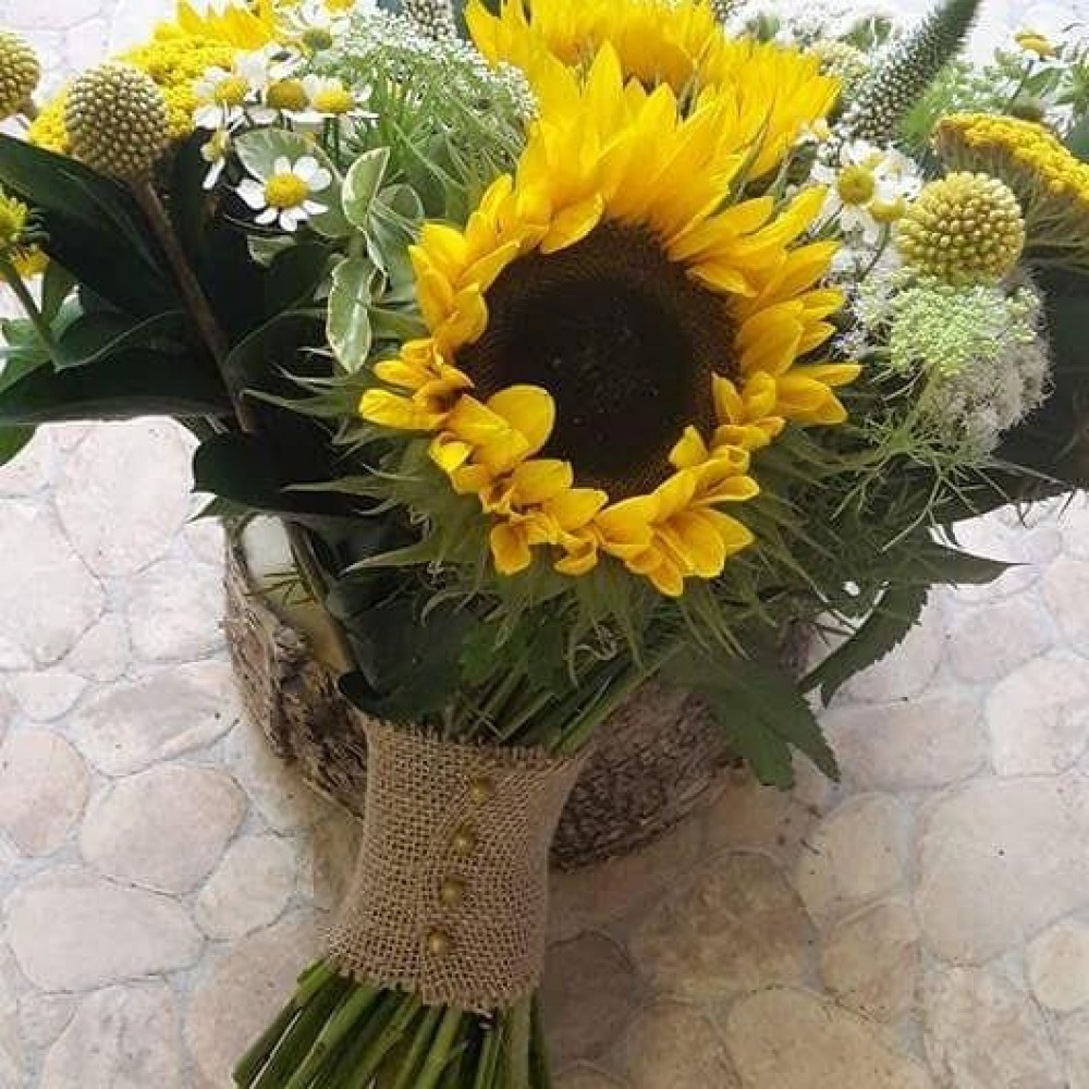 A pretty Sunflower Wedding Posy with complementing filler and greenery. Please call the shop on T: 01948 661111 to discuss flowers content and sizes. Please also provide plenty of notice so we can make sure we get the correct fresh flower content for your posy.