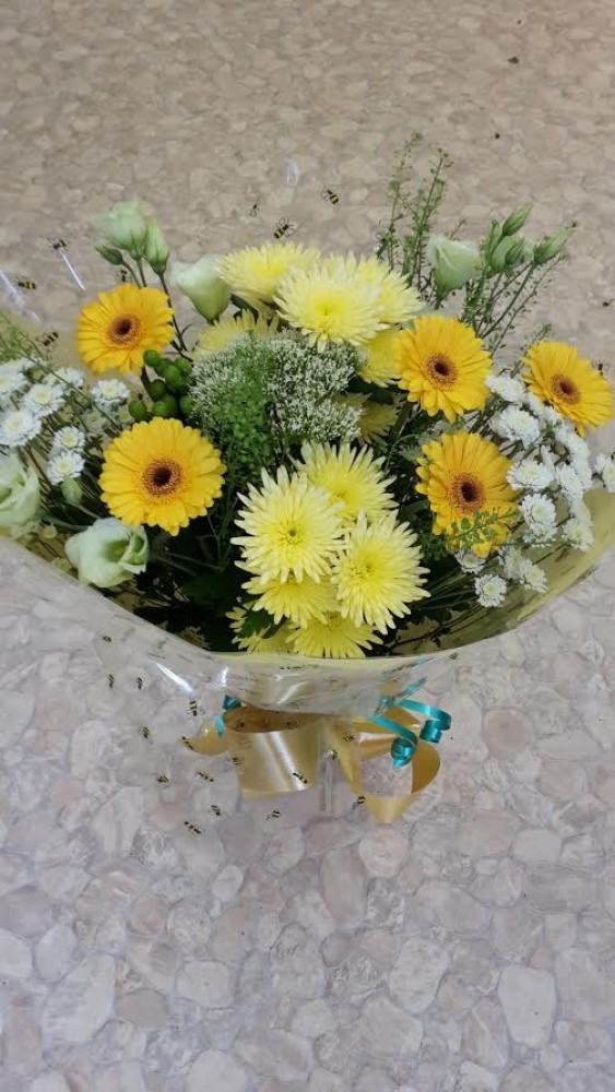 A beautiful seasonal hand-tied of fresh cut flowers in yellows and whites.