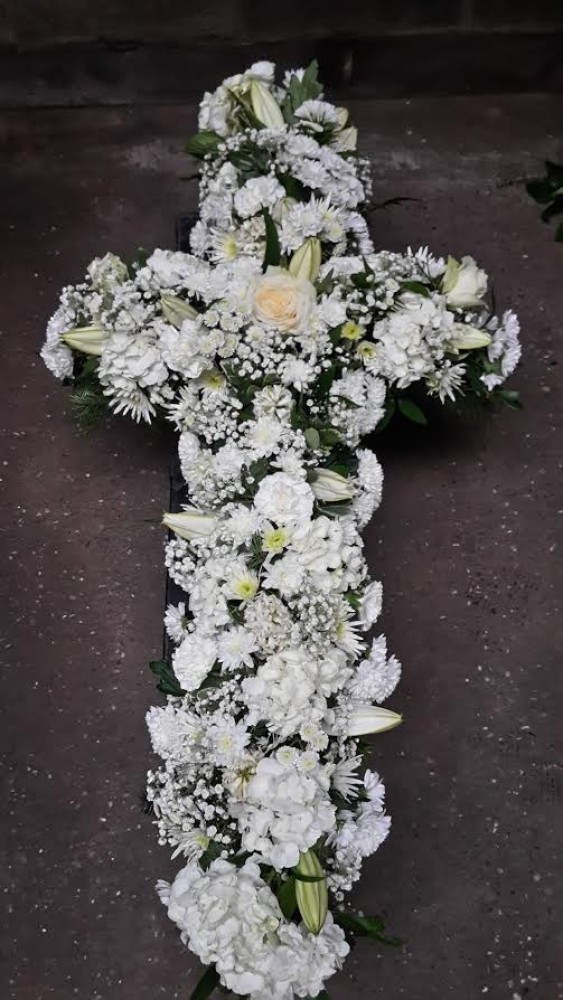 A beautiful cross made up with all white flowers and greenery. Please call us on T:01948 661111 for more information on this funeral product.